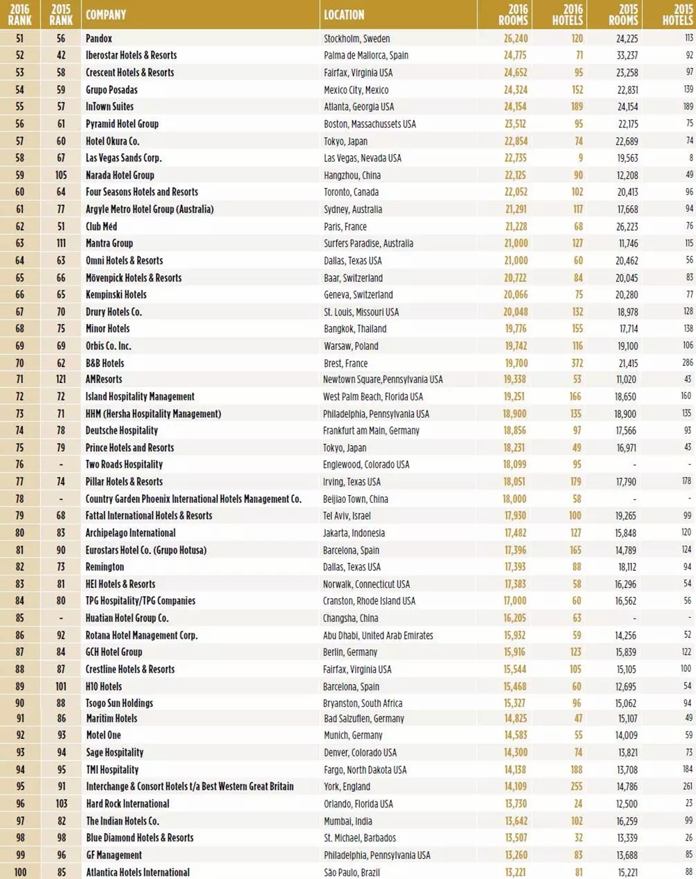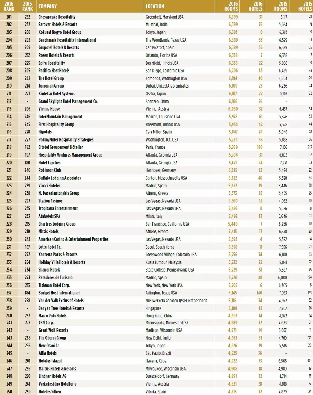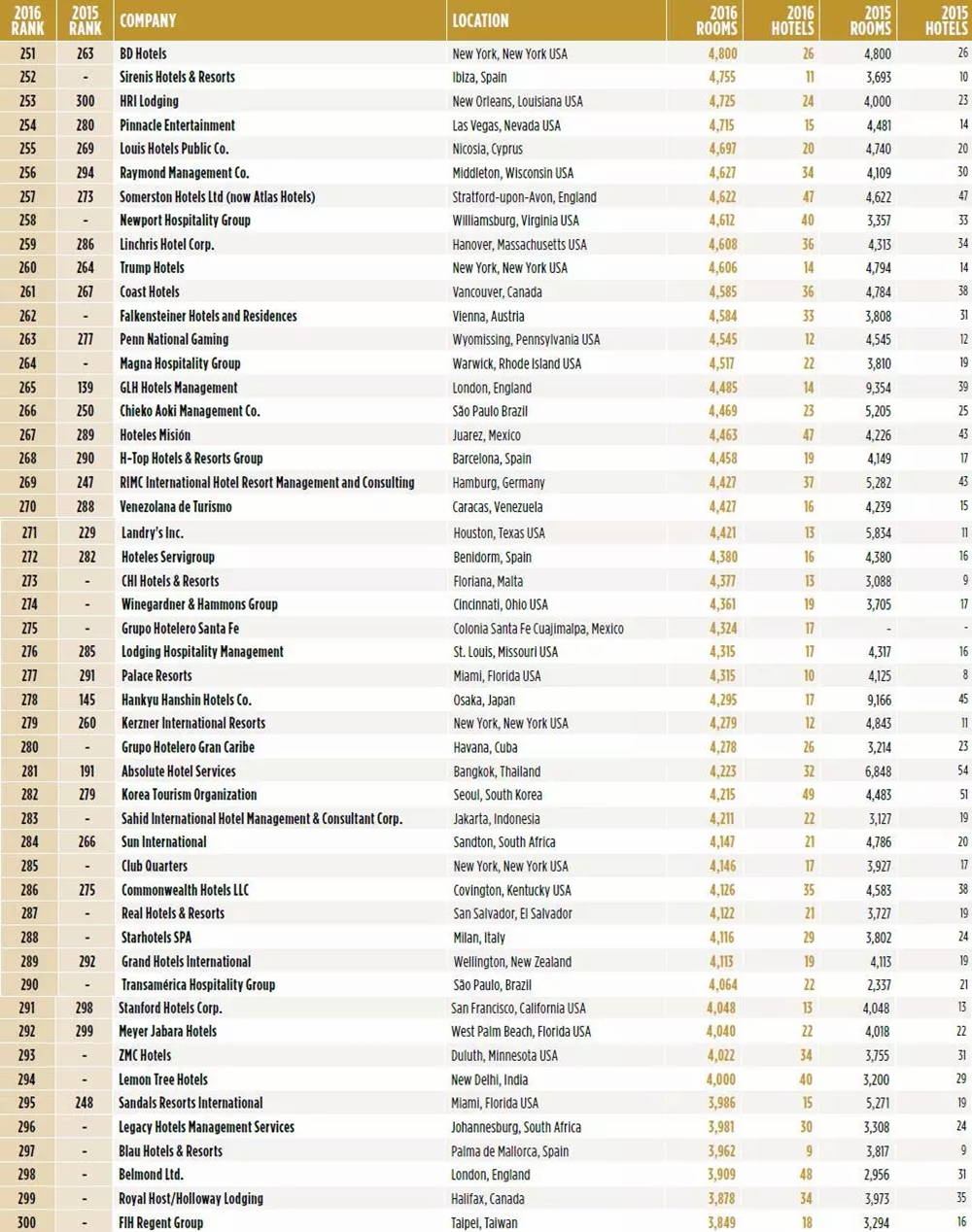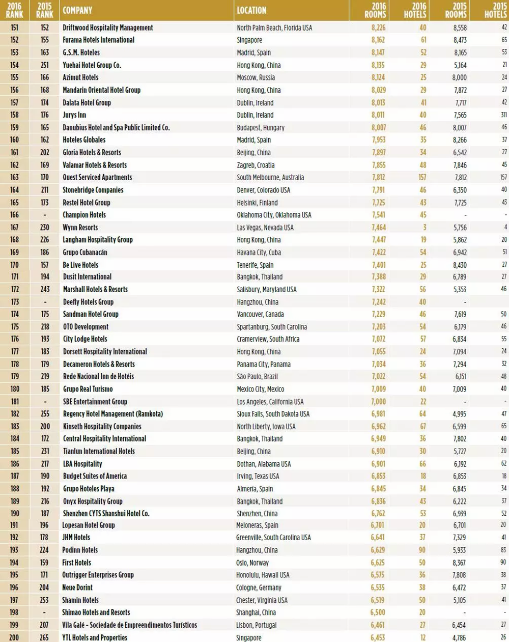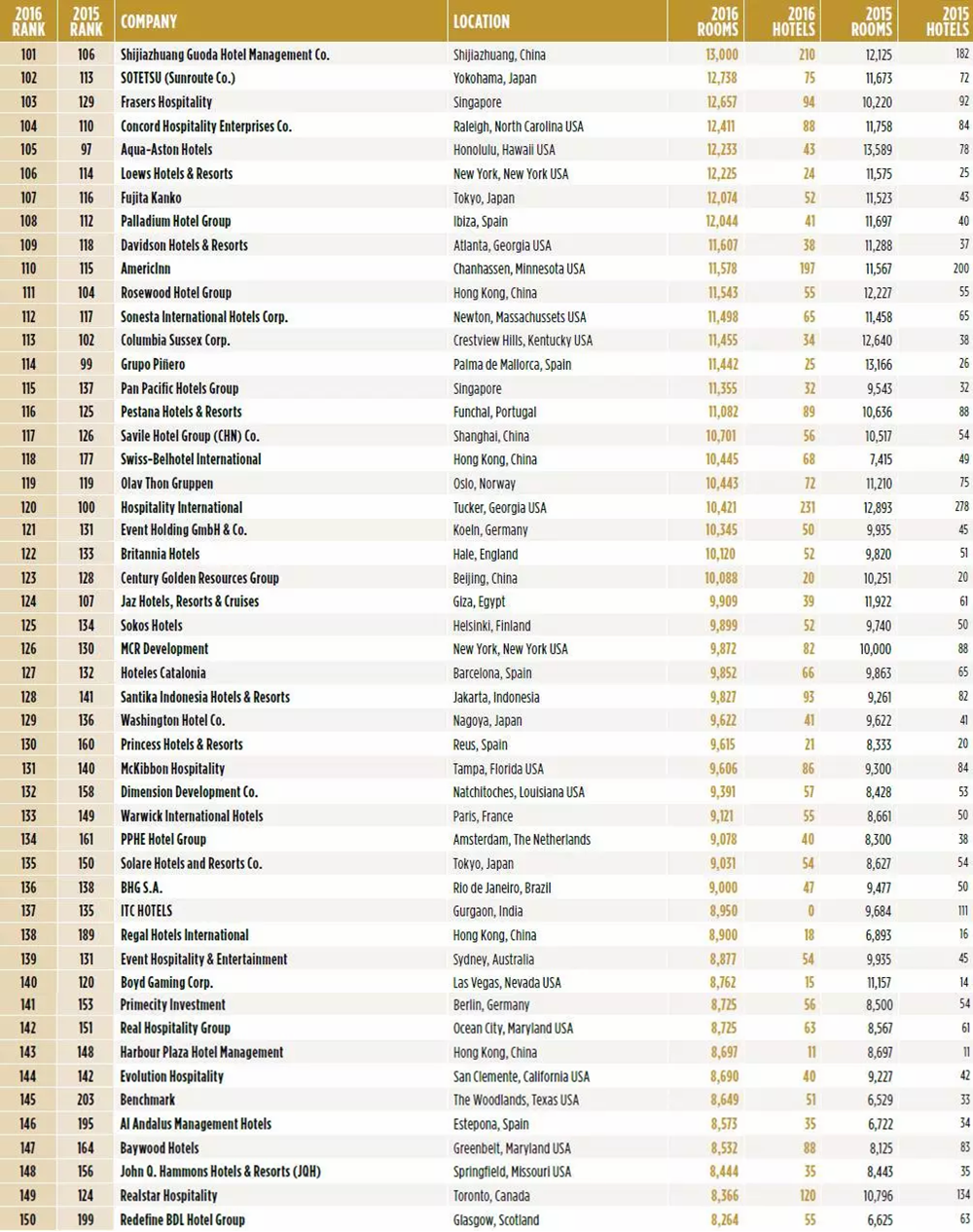 在全球酒店客房数量前300强酒店集团中,海航酒店集团位列第11名,其2015年排名为第47名,港中旅位列第44名,比2015年排名下降一位,格林豪泰、维也纳、尚美生活、东呈国际、开元、99旅馆连锁、香格里拉和金陵酒店集团也位列前50名。而君澜、碧桂园和华天位列前100名。