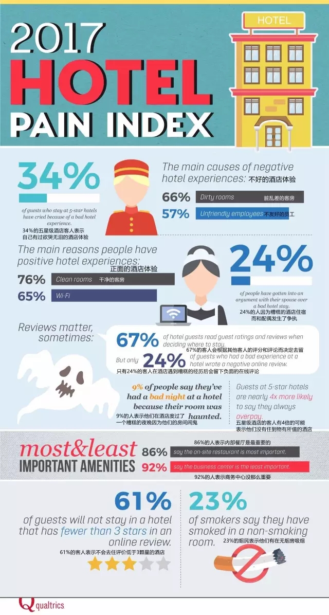 经验管理公司Qualtrics调查了1,000家酒店的顾客并发布了“酒店疼痛指数”研究报告,以了解哪些因素可以帮助酒店改善自己的产品。令人惊讶的是,有近五分之一的客人表示,他们的酒店体验非常糟糕,几乎毁了他们的假期。