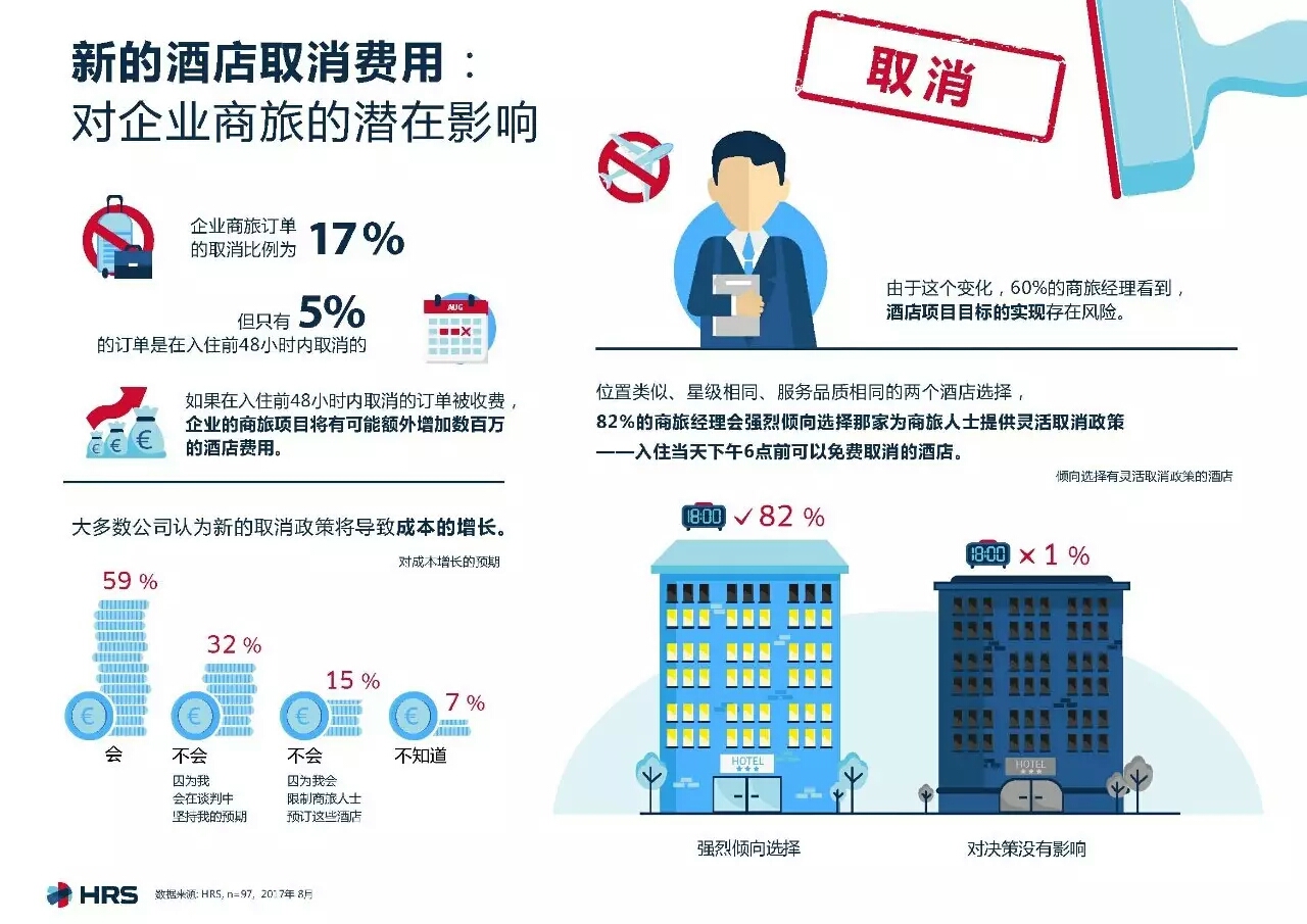 HRS对100名企业差旅经理进行的问卷调查表明,大多数受访者认为新的取消政策将带来更高的成本。60%的受访者认为,新政策将使他们面临无法实现差旅管理目标的风险。因此,约三分之一的企业已经开始与合作酒店洽谈特殊条款。当在两家同一星级、同等服务和类似位置的酒店之间进行选择时,82%的差旅经理会明显倾向选择提供更灵活取消政策的酒店。
