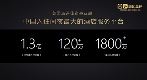赵楠表示,美团定位为酒店综合收益服务商,希望与商家一起将住宿行业的蛋糕做大。基于这样的定位,美团以吃这个高频的基本需求为核心,吸引了大量的用户流量,借此扶持住宿业务以及旅游业务等新业务的发展。目前,美团已经成为中国入住间夜最大的酒店服务平台,2016年入住间夜达到1.3亿,刚过去的7月份,单月用户间夜已经突破了1800万。这样成绩的取得和美团对住宿行业发展的重点关注密不可分。