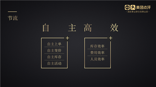 所谓 “D”,就是Direct节流,把酒店的经营权交还给酒店自己,使酒店能够自主地上单、变价,营销以及管理自己的库存。其次借助于美团订单的预付功能以及业内有竞争力的佣金水平,帮助商家提升资金的使用效率。