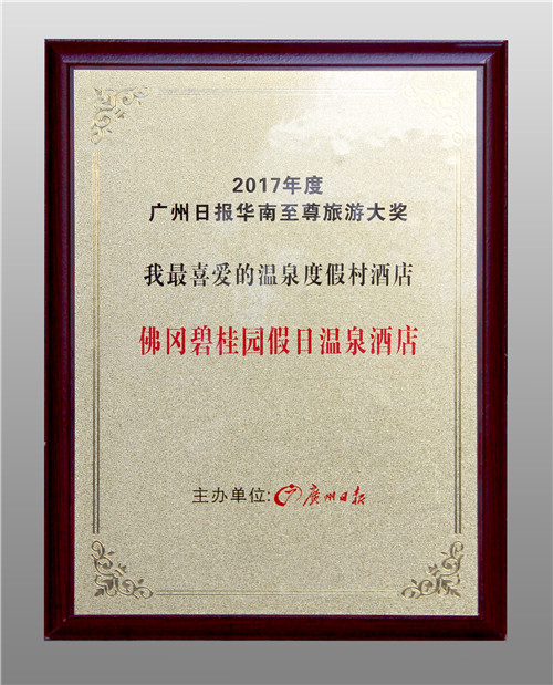 “2017年度华南至尊旅游大奖”是由《广州日报》主办,权威媒体、旅游业界以及读者共同参与的旅游大奖,自今年6月启动以来,受到业界和读者广泛关注,为了保证评选的公众公平,大会采取业界报名、评委筛选、读者投票等多重环节,遴选出华南旅游界的佼佼者。佛冈碧桂园假日温泉酒店凭借优美的自然环境、贴心的服务及优质的养生温泉池群备受旅客青睐及好评,一举摘取“我最喜爱的温泉度假村酒店”奖项。