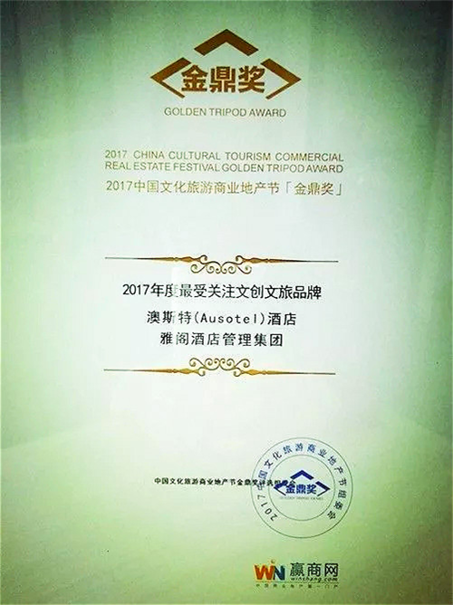 雅阁酒店品牌旗下品牌澳斯特受邀参加了由中国商业地产第一门户网站----赢商网在西安主办的2017年度第二届中国文化旅游商业地产节,并荣获2017年度最受关注文创文旅品牌称号。