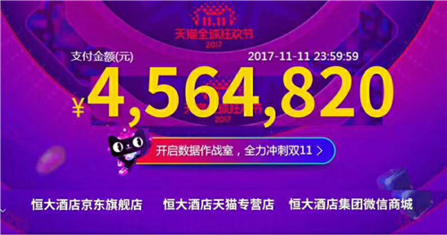 截止11月11日的23点59分59秒,恒大酒店集团2017年“双11”的线上总成交额为4,564,820元,创下了历史新高。