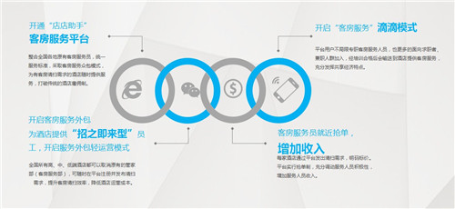 店店助手是胜高股份在原有的酒店业务板块基础上,利用两面市场创新商业理论和互联网平台技术而打造的共享经济新模型,他利用移动互联网工具,线上与线下融合,从线上发布清扫房源到服务员线下提供服务,形成了酒店与服务员紧密相连的O2O闭环。这是胜高基于酒店行业现状做出的具有前瞻性的酒店业“共享新方向”,是胜高在酒店行业开创的 “滴滴模式”。