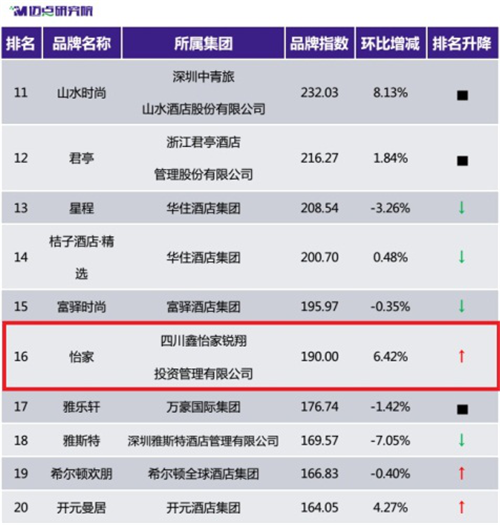 通过运行“怡家壹亲近关怀服务体系”1年多以来,怡家酒店不断得到行业和社会的认可,在11月全国有限服务中档酒店品牌中排名TOP16。