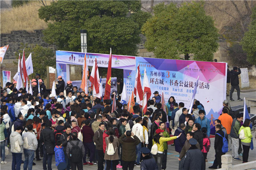 “读万卷书,行万里路。”元旦上午,第三届“环古城·书香公益徒步”活动在苏州环古城健身步道上热闹开启。来自苏州创元集团、文旅集团、城投公司、水务公司、书香酒店以及苏州卓越高校校友联盟的近1000名徒步爱好者齐聚相门古城墙广场,以公益徒步的形式迎接崭新的2018年。这也是继2016年初苏州环古城健身步道建成开放以来,书香公益徒步第三次为爱前行。