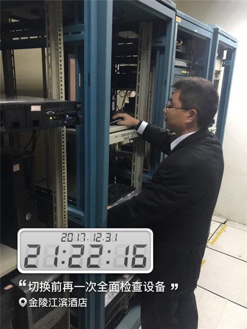 据项目组负责人殷颖介绍,此次酒店板块业务管理系统切换,除了金陵业务和IT部门组建的项目组,还邀请了系统供应商北京中长石基信息技术公司项目组,酒店前台系统供应商西软公司项目组,官网系统供应商德比软件公司项目组,微信供应商金房卡信息科技公司项目组提前来到现场支撑。12月31日晚22点正式开始系统切换,酒店提前进行夜审,54家系统直连酒店和5家半手工酒店及联盟酒店同时联动,在现场项目组的协助下,按照预定计划顺利在23点前完成夜审工作。零点23分,项目组全部完成酒店前台系统代码切换工作,至此各成员酒店开始使用新SOP代码。金陵和所有供应商人员连夜测试,保证中央系统与所有成员酒店间系统对接无误。在2018年1月1日早晨7点48分,包括餐饮系统和所有与中央系统相关功能,酒店前台系统全面恢复使用,前中后台数据全部打通,最终圆满完成系统切换。
