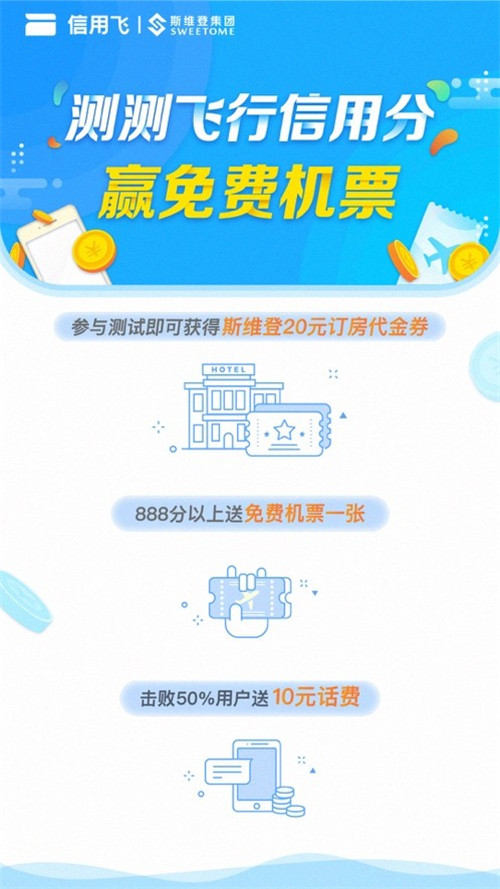 活动针对双方会员通过“测测飞行信用分”的趣味测试展开,带来“免费机票”、“新春福袋”、“斯维登新春心动专享”三重惊喜。飞行信用飞达到888分以上的用户有机会获得免费机票一张;参与测试的用户都可以获得“新春福袋”,内含10元话费、20元斯维登订房券以及首付游3期免息券;“斯维登新春心动专享”专为春节前后的出行,提供原价3折起的优惠,不喜欢在人山人海中的旅行,不如来一次聪明的“错峰”旅行。