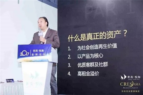 他认为资产有四个方向:一、为社会创造再生价值。这跟政府需求在同一个方向,同时也能为大众创造新的就业、新的经济增长点和新的价值观念;二、以产品价值为核心。所有房子的核心是居住,居住的核心是产品,所有的营销、包装、广告都离不开房子适不适合居住,住的舒不舒服这一方向;三、拥有纯粹的客群和良好的社群。设想一下,当你走进一个空间,有小孩、快递公司、群居客人、办公室等等,就快递公司而言会打扰很多人的平时生活,会占据社会资源、空间等等,这就说明了纯粹的客群和良好的社群对于资产增值的重要性;四、你的地方为什么比别的好,你的自持有没有价值,其中起关键作用的就是高租金溢价。