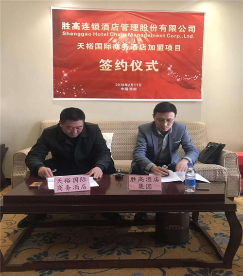 2018年2月,临近狗年春节,千家万户都弥漫着汪年将近的喜悦气氛。在美丽的信阳市,胜高酒店集团再次传来捷报,在集团董事长盛宏军的带领下,胜高团队攻城拔寨,于2月11日签约信阳天裕国际商务酒店。这是胜高自调整加盟业务发展城市布局战略:布点城市从一、二线城市向三、四线等全国重点城市转移以来,继江西南昌、丰城多家加盟店入驻胜高系之后,又一国内重点城市加盟胜高。