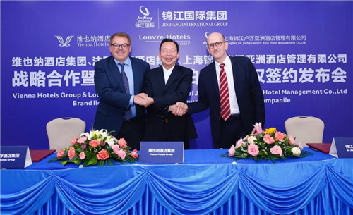 维也纳创始人兼董事长黄德满(中)、法国卢浮CEO Pierre-Frédéric ROULOT(左)、锦江卢浮亚洲CEO Joёl GUIRAUD(右)