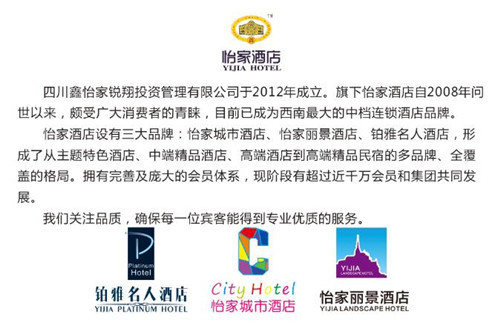 开放、分享、服务,为用户提供更高品质、更便捷、更多元的产品和服务,我们始终把顾客的满意度及为顾客提供一流的服务放在首位,不断以家文化和怡家壹亲近关怀服务体系为顾客提供和创造超越预期的住宿体验。正是基于此, 怡家酒店不断赢得了行业的高度关注及消费者的青昧,同时也赢得了近千万的怡粉 ,相信在未来的发展中,怡家酒店集团必将成为行业中的一群黑马。