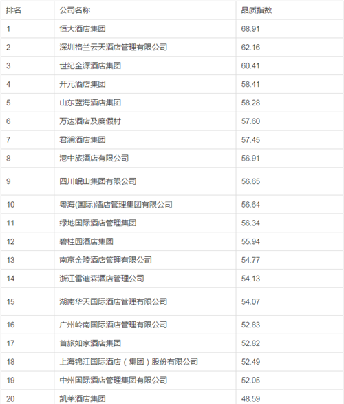 2017年度中国品牌连锁饭店集团(管理公司)品质榜前20名