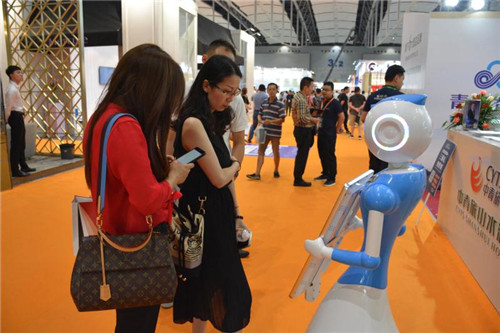 三天的展会,在中青旅山水酒店集团展馆附近往返穿梭的机器人“小青”俨然成为全场的明星,众多参展商和观众或拿出手机与“小青”合影,或驻足在“小青”面前,体验智能语音对话、自助入住办理等服务。