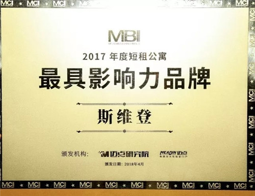 斯维登公寓获2017年度短租公寓“最具影响力品牌”