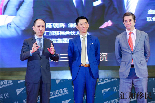 第五届汇加·胡润中国投资移民白皮书6月30日上海(从左至右:胡润百富董事长兼首席调研员胡润,汇加移民陈朝晖律师,途家及斯维登集团联合创始人兼CEO罗军)