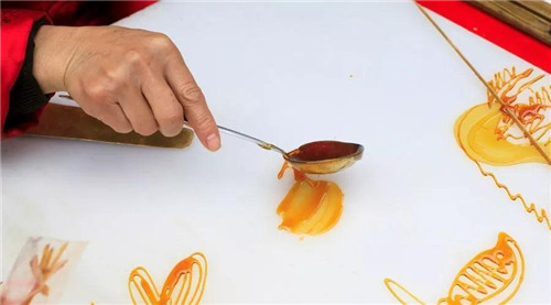 糖画,民间俗称“倒糖人儿”、“倒糖饼儿”或“糖灯影儿”。分为平面糖画与立体糖画两种。题材广泛,多为龙、凤、鱼、猴等普通大众喜闻乐见的吉祥图案。