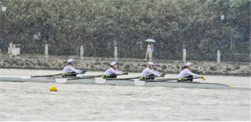 (铂涛女四双队伍在大雨中比赛,并最终夺冠)