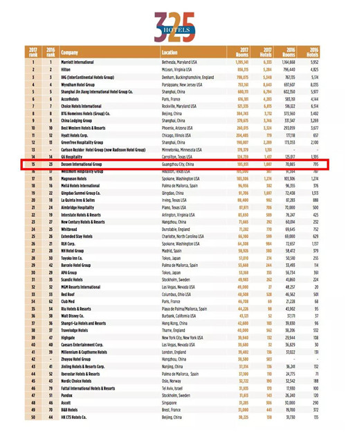 2018《HOTELS》杂志全球酒店集团排行榜东呈国际集团跃居15名