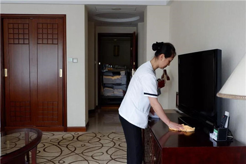客房服务员认真清扫每一间房,关注宾客睡眠习惯提供安睡枕。
