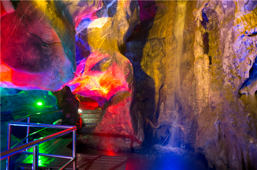 紫薇洞与一般溶洞不同,它是一座国内罕见、特色鲜明的地下河型洞穴。紫薇洞洞全长1500米,洞体宏阔,结构立体,洞内10大洞天,36主景,72辅景,先是陆路游览,后转水路泛舟,洞内景观奇特,以雄、奇、险、幽著称。不能不提的紫微洞三奇之一——“铁索寒桥”,在国内的溶洞里很少会有悬空的部分,紫微洞有两处是完全悬空的状态,所以这里不得不修建一座铁索桥,走在晃悠“铁索寒桥”上,别有一番历险的味道。