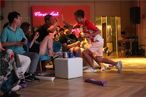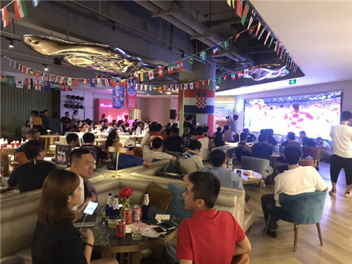 拒绝单调的场地提供,漫心为匹配巅峰之战对漫趣大堂”做了个性化的环境布置,这给予了球迷最佳的看球姿势,免费赠送明星球服和国旗贴纸,让住客宣告自己的鲜明立场;现场还可与美丽火辣的外模合影,假装在国外; RIO微醺鸡尾酒;精美小食……众多缤纷多彩的精彩活动环节设置让球迷们感受到了一场活色生香的看球体验。当晚现场气氛热烈活跃,高潮迭起,进球时的欢呼声更是嗨爆现场。恰逢世界杯期间,很多酒店都推出了类似的活动,但酒店客人参与的积极程度各不相同,那漫心为什么能大获成功?