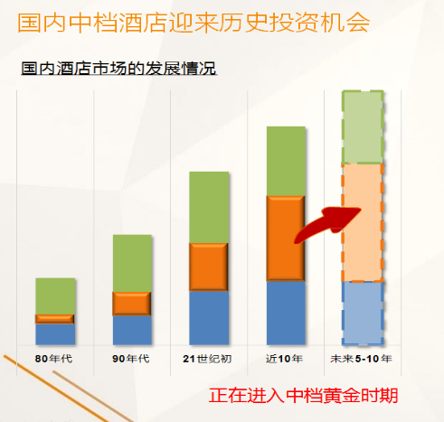 从行业的现状来看,兼并收购后形成了国进民退的大量国有企业优质资产和民营企业,保持了国有企业的经济以及民营企业的活力。此外,还可以看到市场的机遇。酒店行业从萌芽到成长、成熟到衰退有经济规律,可以看到在国内几种业态布局之下,不管是前期的经济型酒店还是高端酒店,不是目前投资的重点。在中档酒店方面,实际上这是未来很核心的需求。