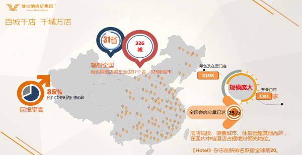 维也纳酒店2014年300多家门店,2015年是500多家门店,截至今年会达到1000家酒店的规模。从高星到中档酒店已经签约了521家,自身的体量已经达到了2100家的整体规模,速度呈现爆发式的增长。这个爆发式增长随着投资人以及消费者的越来越理性,经济下行、制度限制以及消费升级给中端酒店带来的巨大改革开放红利。