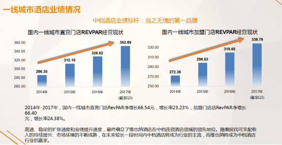 为什么要讲投资回报?维也纳是目前国内比较接地气的品牌。看锦江披露出来的财报,在营的100多家门店出租率是90.2%的成绩,RevPAR从2014年到2017年直营店和加盟店每年都增长20多块钱,是不断向上的增长。从整体经营数据来看,还是比较适合当前很多地产开发商的选择。