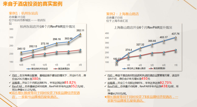 去年在杭州东站开业了一家维也纳国际酒店杭州东站店还有上海衡山路店。开业6个月,从去年10月份到今年3月份增长了180元的房价,RevPAR增长已经做到了350多。短短半年时间内能够把出租率做到90%以上。上海衡山路店也是如此。