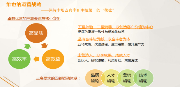 维也纳漂亮的运营数据,和运营体系、销售体系和会员体系密不可分。内部叫做“四轮驱动”的品质战略,就是围绕高品质、高效率、高效益的“三高”效果,采用四轮驱动,通过核心商业模式,五星体验、二星消费的模式,和品质、产品与经营管理达到四轮驱动的要求。对于内部员工的激励也是采用非常好的激励政策,像华为一样。我们崇拜华为的狼性精神,同时也崇拜华为“以奋斗者为本”,坚持“奋斗与贡献,以奋斗者为本”。民营企业就是保持活力与残酷竞争的本质,在外部与品牌竞争的时候,是非常高度的狼性精神,无论是项目还是市场销售都是如此。最终维也纳是以结果为导向。