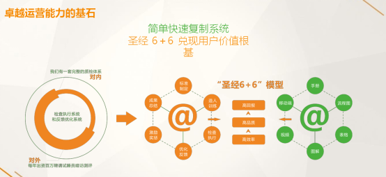 在运营方面,遵循“圣经6+6”的模式,建立培训体系,通过训练系统、奖惩系统、总结系统并且不断优化,最终保持的是品牌和产品的高度一致性。