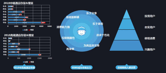 OTA平台就像货架,需要主动跳出来让消费者看见。如果把全国划分为几个区域,这些区域当中的增量仅仅定位在中高端酒店的品类中。从三个酒店案例当中可以看到群体最大的特点是他们有非常强的互联网属性,愿意为高品质的产品买单。80后已经不是主力市场了,90-95是非常值得分析。