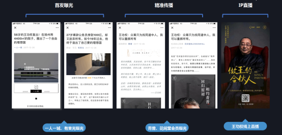 在IP裂变的时候首先找到传播性,就是以人物故事为主的阅读性。再来就是有计划的传播,最后我们为王功权做了一次线上直播,让他当了一把网红,在很多短视频平台上同步发起了一次对王功权个人的采访,当时整个IP上线直播量将近5000万。