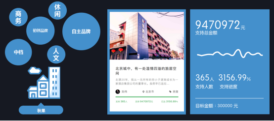 秋果在整个平台上做过四次众筹,每家店全部都是通过众筹的方式开店,在平台上募集的资金是4600万。在我们平台上做过很多大住宿品类项目,有两个品牌让人印象深刻,社群营造能力或者社群运营能力非常强,一个是秋果,另一个是安徽黄山德茂堂(音)。