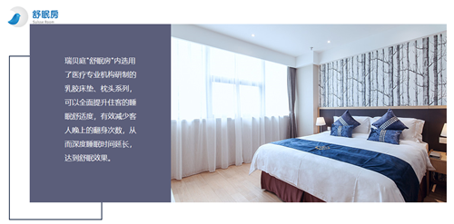 瑞贝庭独创的舒眠房不仅提供专业医疗级睡眠系统(高品质乳胶床垫、睡枕系列)、独立的空气净化系统,还增设了各种陈设细节和小物件,所有的一切都在帮助住店客人,能睡个好觉。我们会模拟客人的不同场景,让客人在不经意中体验到“舒眠服务”。比如让顾客喝舒眠酸枣茶助眠,闻香入睡,仰望星空做个美梦,甚至是白噪声音乐把客人带入梦境。可以说今天的睡好觉不再是简单的事,是需要注意各个细节,对酒店方方面面综合人性化,科学化轨迹的讨论和思考。我们明确定义了新时代好酒店标准,不再是刻意的富丽堂皇,而是合理化标准化的体验,让舒适的好心情,每个心理暗示都能帮助消费者在每个细节避免造成失眠和不愉悦体验。我们忌讳使用轻度抑郁人群会看上去紧张的色系,我们甚至会考虑窗帘拉上,灯光打开产生的暗影是否影响睡眠,让人产生不良联想,甚至不贸然使用妖艳花纹窗帘,在整体酒店的常规陈设物体上我们选择让人舒适的搭配,床品上更不必说,自然是助眠体验作为首选思考。
