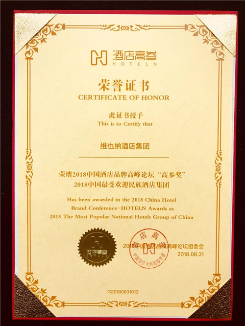 维也纳酒店集团荣获2018最受欢迎民族酒店集团