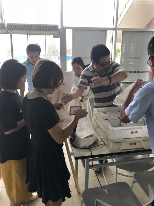 中午,终于等到来吃饭的教师们,各位老师纷纷驻足,表示出浓厚的兴趣。渐渐地买月饼的队伍排的越来越长,工作人员开始加快速度,争取不浪费各位老师宝贵的午饭时间。