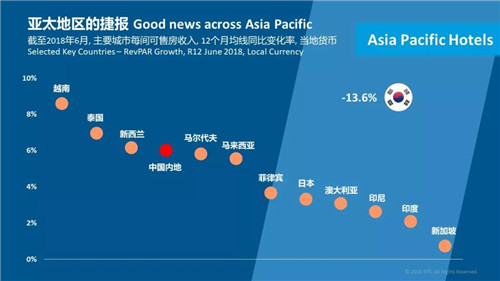 回顾2018上半年亚太地区市场业绩表现,除韩国呈现业绩负增长外,大多地区近12个月每间可售房收入同比变化率平均值均呈上升势态。在亚太地区主要国家中,越南在上述指标上的增长赶超新西兰,一跃至亚太地区首位;中国内地市场表现同样可圈可点,涨幅持续走稳。新加坡则受市场供给量持续增长的影响,虽已经摆脱业绩负增长的局面,但业绩增长速度依旧迟缓。