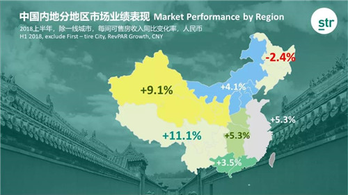 纵观中国内地各地区在2018年上半年的业绩表现(除一线城市),西南地区涨势明显,西北地区借助“一带一路”政策特惠,业绩增长紧随其后,每间可售房收入同比增长分别高达11.1%和9.1%。西北地区受当地经济发展水平影响,由于基数低,因此业绩提升相对简单;而涵盖了成都、重庆和云南等热门市场的西南地区,酒店业相对发达且旅游资源丰富,如今休闲度假游如火如荼地盛放,为该地区注入了新的活力。 东北地区作为唯一呈现业绩负增长的区域,入住率的明显缩水,使得每间可售房收入同比下降2.4%。