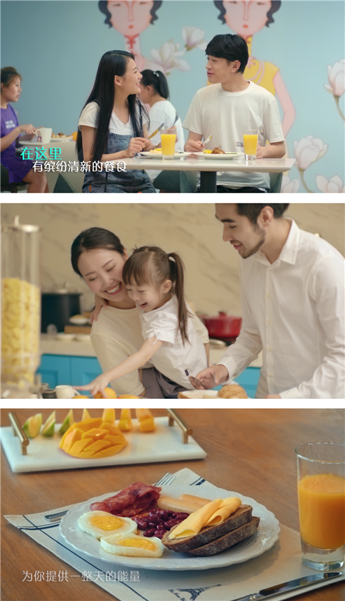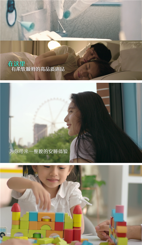 巧妙利用微缩模型来还原白玉兰酒店的真实场景,用真实的手穿梭于画面进行互动,这样的做法在使画面真实精美,生动形象。从微缩客房、餐厅、大堂分屏切换到实景酒店客房、餐厅、大堂,又以特写表现出客房床品的高品质、餐厅食物的缤纷美味、轻松灵动的城市会客厅。每一帧单截出来,可以说都达到了电影级的质感。