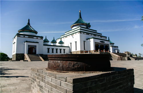 成吉思汗庙建在乌兰浩特市的罕山之巅,而罕山是龙脉之所在。庙宇融汉、蒙、藏三个民族建筑风格,坐北朝南,正面呈“山”字型,方身圆顶,整体共有大小9个圆形尖顶,用绿色琉璃瓦镶铺,加之朱门粉壁相衬,实为壮观。