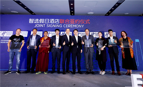 智选假日酒店大中华区副总裁邱尤(左五)、智选假日酒店中国区发展副总裁金璐翊(左六)及在北京投资品鉴会现场签约的8家智选假日酒店业主代表