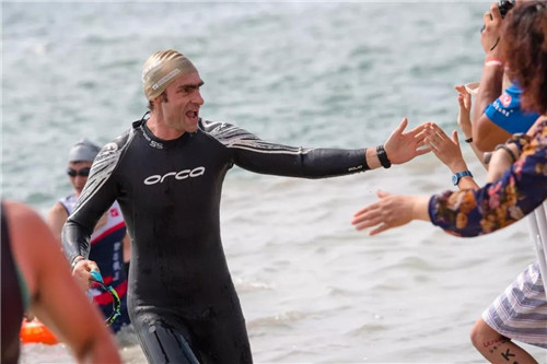 选手完成游泳比赛环节后与观赛人群击掌庆祝