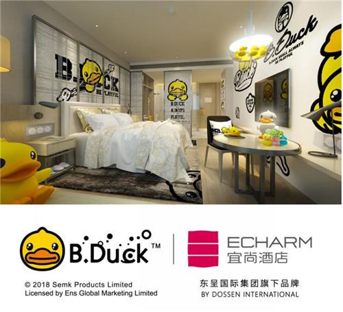 6月东呈年中开业庆典上,旗下主力中档品牌宜尚,与香港潮牌B.Duck在全国中档酒店范围内达成独家IP合作。今年国庆期间,第一家宜尚×B.Duck主题房已经在宜尚酒店无锡中南路店上线。