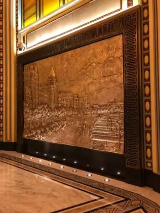 走进酒店,步入大厅的第一眼便看到换上彩色玻璃顶的八角亭四面照壁上,饰以四幅银箔浮雕"外滩印象"。从四个不同的视角,对外滩、浦江两岸的旧时境况作了艺术刻画,和平饭店自然也被绘入其中。雕刻之精细,我一靠近就努力屏住呼吸,生怕一口气不小心便吹走了那一丝丝银光。