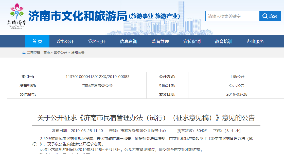 3月28日,济南市文化和旅游局网站发出《关于公开征求《济南市民宿管理办法(试行)(征求意见稿)》意见的公告》,这是山东省首个市级层面征求意见的《民宿管理办法》。