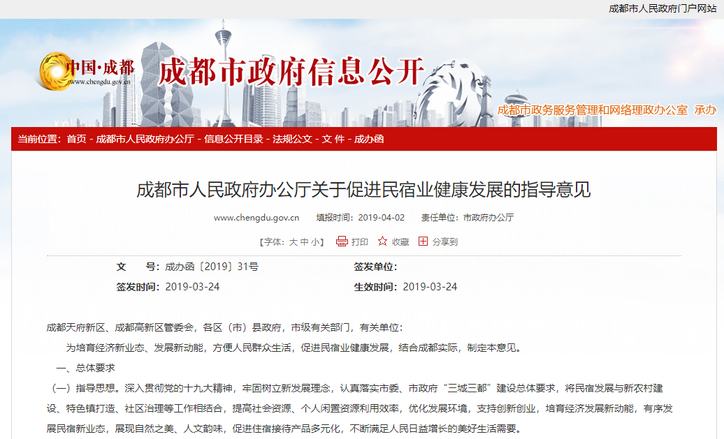3月24日,《成都市人民政府办公厅关于促进民宿业健康发展的指导意见》正式生效。