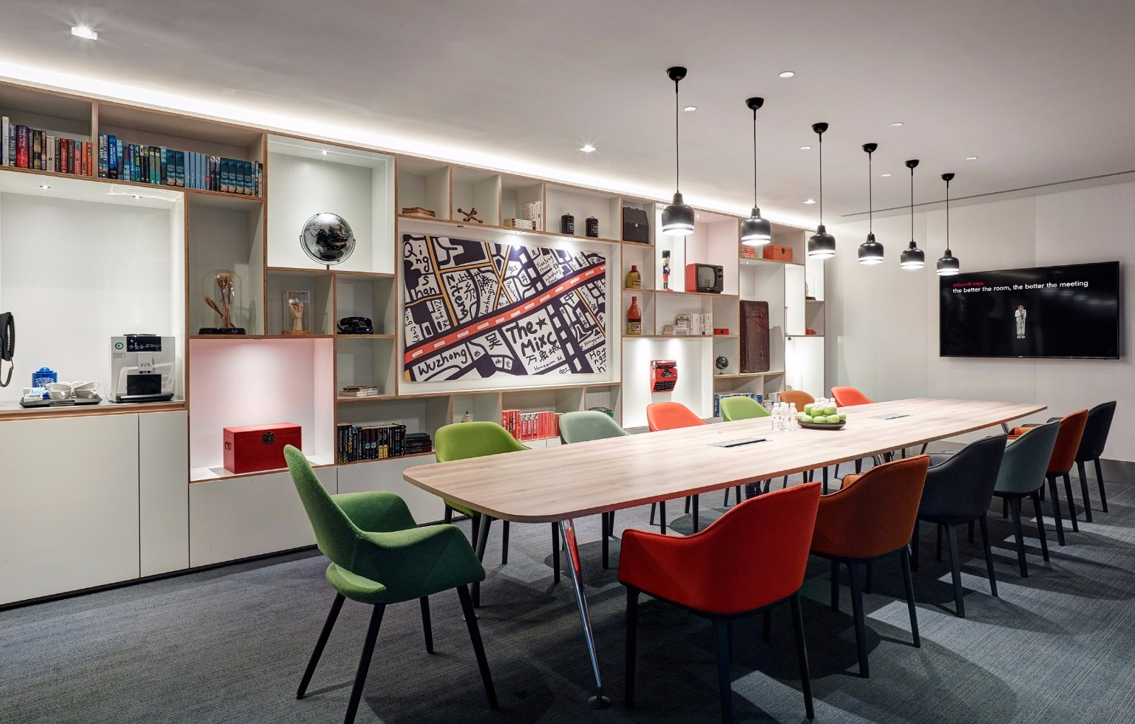 作为一个服务商务出行人士的酒店品牌,citizenM酒店同样也提供专业的会务服务。酒店设置了一整层楼的会议区,客人可经由“起居室”的旋转楼梯进入 societyM 会议套间。和酒店客房一样,8 个创意会议空间(最大的房间可容纳 16 人)和一个休息区也配置了令人印象深刻的智能科技和现代设计:色彩明快、符合人体工程学的 Vitra 家具、完备的办公用品、超大液晶电视,以及免费无限量供应的茶点;所有会议室都毗邻一个可以欣赏一楼起居室美妙艺术的内阳台。societyM会议室为酒店客人、当地企业,以及任何有会议、发布会、采访、授课等活动场地需求的办公人士提供会务服务,提供半天或全天租用服务,另可承接餐饮。